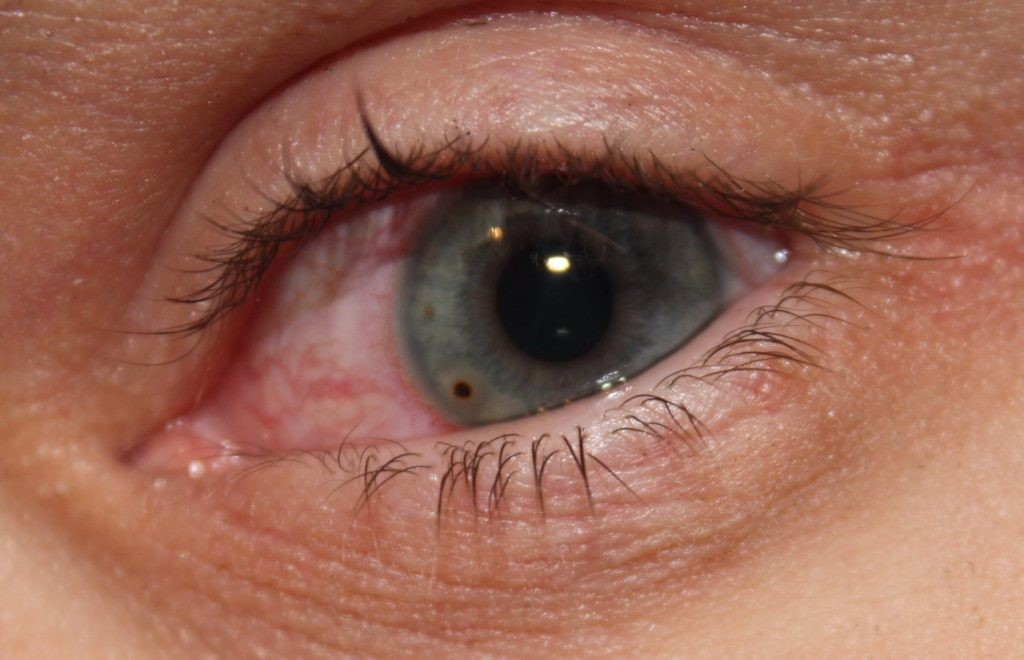 дискомфорт, різь та печіння, відчуття стороннього тіла в оці; почервоніння ока, сльозотеча; світлобоязнь; зниження зору;
